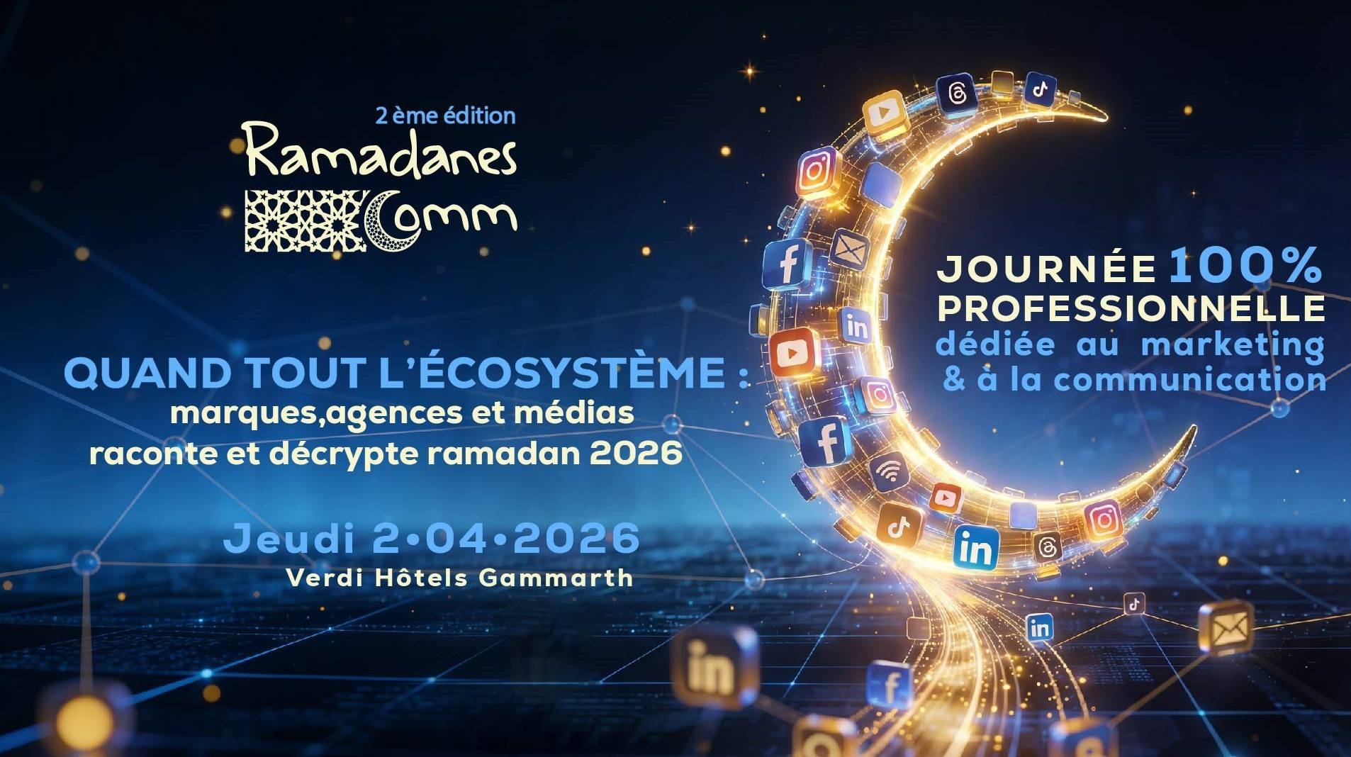 En prenant par à la soirée RAMADANES'COMM,votre image sera dynamisée par la volonté de soutenir tout l'écosystéme du marketing et de la communication et des médias
